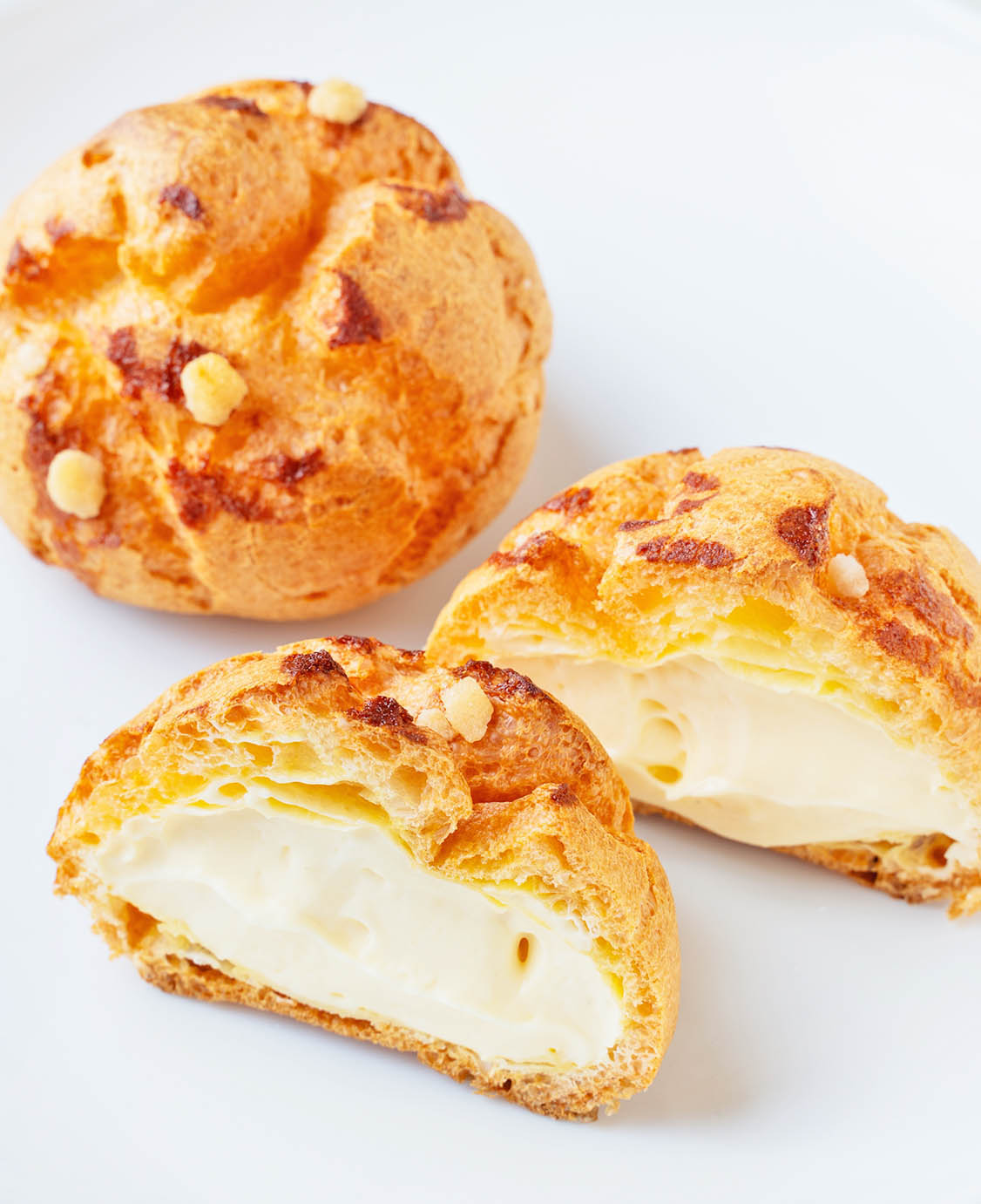 定番商品「うっふシュー」は、1つの商品に卵黄を2つ使うほか、こだわりの小麦粉や濃厚なジャージー牛乳など選び抜かれた原料を使って作っています。